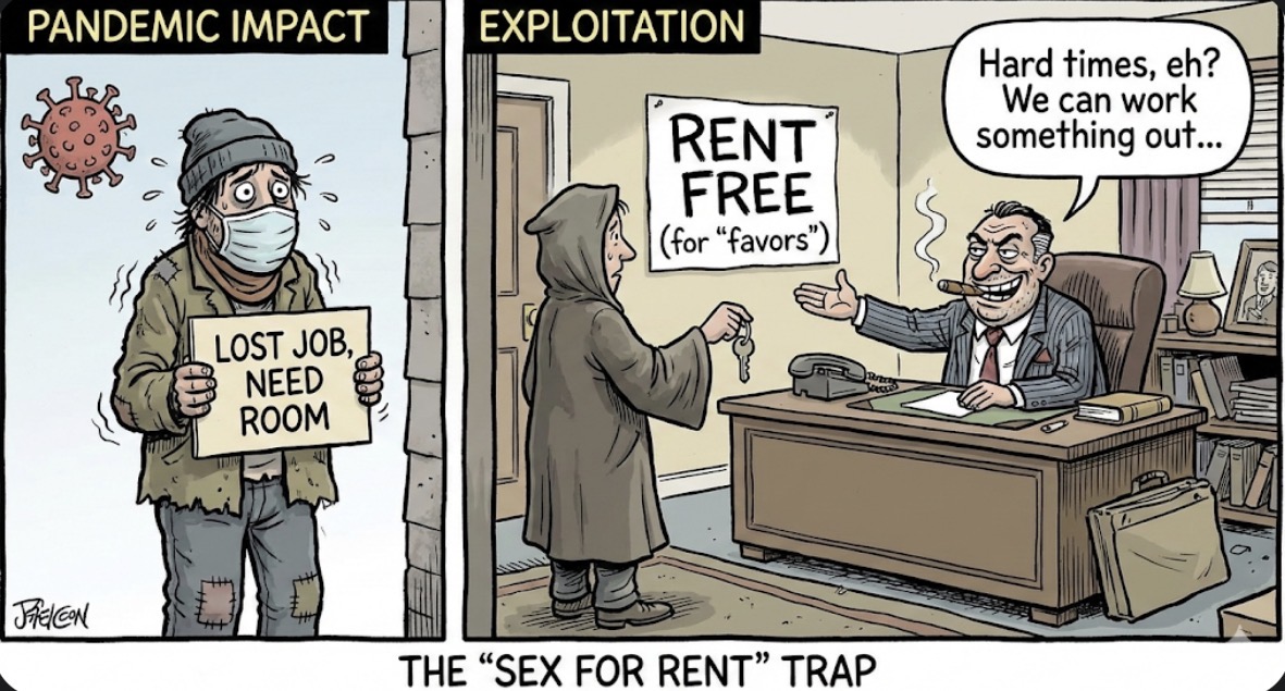 2021 年 4 月,正值武漢肺炎(COVID-19)疫情肆虐全球之際,許多人因封城失去工作、經濟陷入困頓。一名美國女生因為付不出房租,嘗試詢問房東能否降租,得到的卻是一張不堪入目的私密照;另一名失業女性請求延後繳租,房東卻回覆:「妳過來陪我就好。」