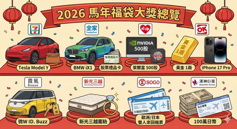 今年(2026)的特色是「豪車大戰」與「股票投資」風潮,便利商店大獎甚至包含特斯拉、BMW與輝達(NVIDIA)股票。